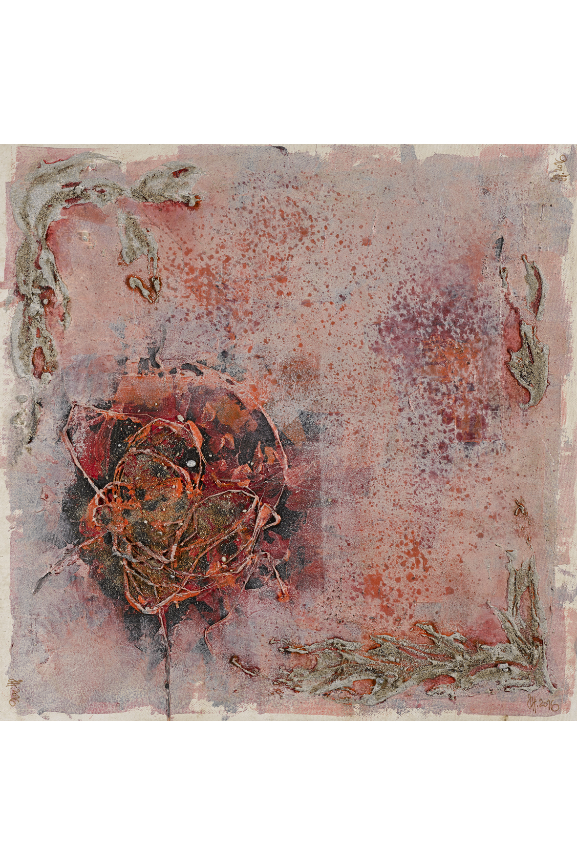 Momente der Schöpfung?? Es entsteht im Kopf (meldet sich) zuerst das Thema, was auf Papier/Leinwand will. Schicht nach der Schicht bekommt das Thema, was ich gewählt habe, die Form.. Farbe und Form.. Schicht nach der Schicht. Bis alles durch die Form und Farbe gesagt ist. Bis zur Signatur. Ich signiere auf der Vorderseite, und bis zu 4x. Es ist egal, wo oben und unten ist.. Meine Bilder können wir von allen 4 Seiten betrachten. 4 Seiten eines Bildes – und 4 verschiedene Sichtweisen von einem Thema. Mit mehreren Signaturen gebe ich dem Zuschauer die Möglichkeit seine persönliche Betrachtungsweise zu finden.
